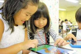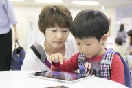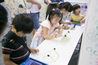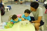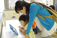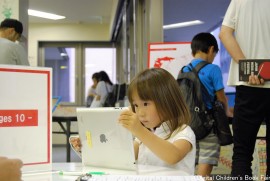 The Digital Children’s Book Fair 2015 was organized in three sections; ‘Continent Booth’ which was set near the wall, ‘Age Booth’ which was set on the lower round table, and the sponsor ‘Sagomini’ booth.‘Continent Booth’ was divided in three sections; Asia & Oceania, North America & South America, and Europe & Africa. Children were able to explore various apps that were produced around the world. At the ‘Age booth’, apps were divided in groups; apps for infants, kindergarten children, and elementary school children. At the ‘SAGOmini’ booth, ‘SAGOmini’ apps were exhibited exclusively. Wide age range of children, from infants to elementary school students seemed to have enjoyed the book fair.